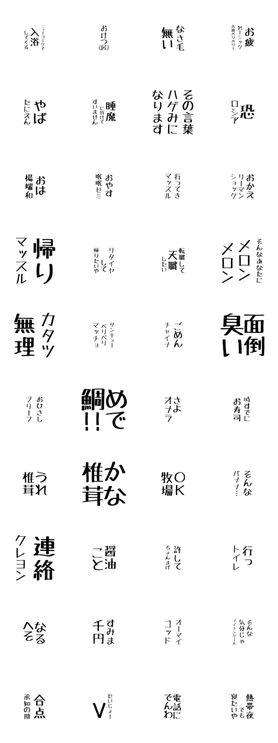 多弁でダジャレな私なんですが。 コミュニケーション能力が実はあまりありません汗 少年期に、あまりいい思い出がない(いじめなど)。 そんな私は時折、病的なんじゃないか?? と振り返る事があるダジャレのふきだしスタンプです。 ゆるいキャラクターの寒いギャグがさりげなくトークを盛り上げます。 ¥1 1%還元 リストに追加する LINE Payやキャリア決済等 で買えます!ダジャレの木(ダジャレ集) 1 ああ、馬勝った、牛負けた。 3 あたらしいものがあったらしい。 5 あったかい飲み物はあったかい? さむいーーーーーーーーーーーーーーーーーーーーーーーーーーーーーー 7